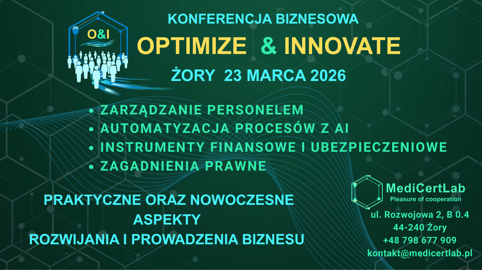Konferencja biznesowa Optimize & Innovate, organizowana przez firmę MediCertLab w Akceleratorze Biznesowym Kssenon w Żorach w dniu 23 marca 2026 roku, to wyjątkowe wydarzenie dedykowane praktycznym i nowoczesnym aspektom prowadzenia biznesu.